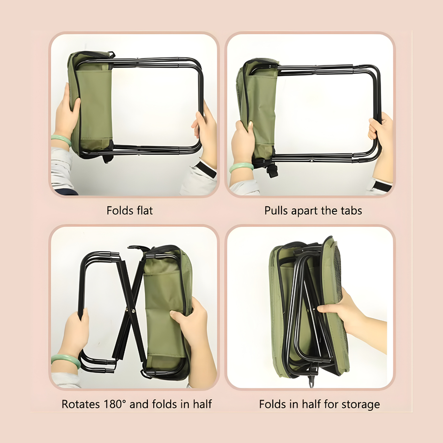 Die Konstruktion verzichtet bewusst auf eine Rückenlehne und fokussiert sich auf geringes Gewicht und hohe Mobilität. Durch den Klappmechanismus ist der Hocker schnell einsatzbereit und ebenso rasch wieder verstaut. Im Verstauten zustand kann er als kleine Tasche benutzt werden.